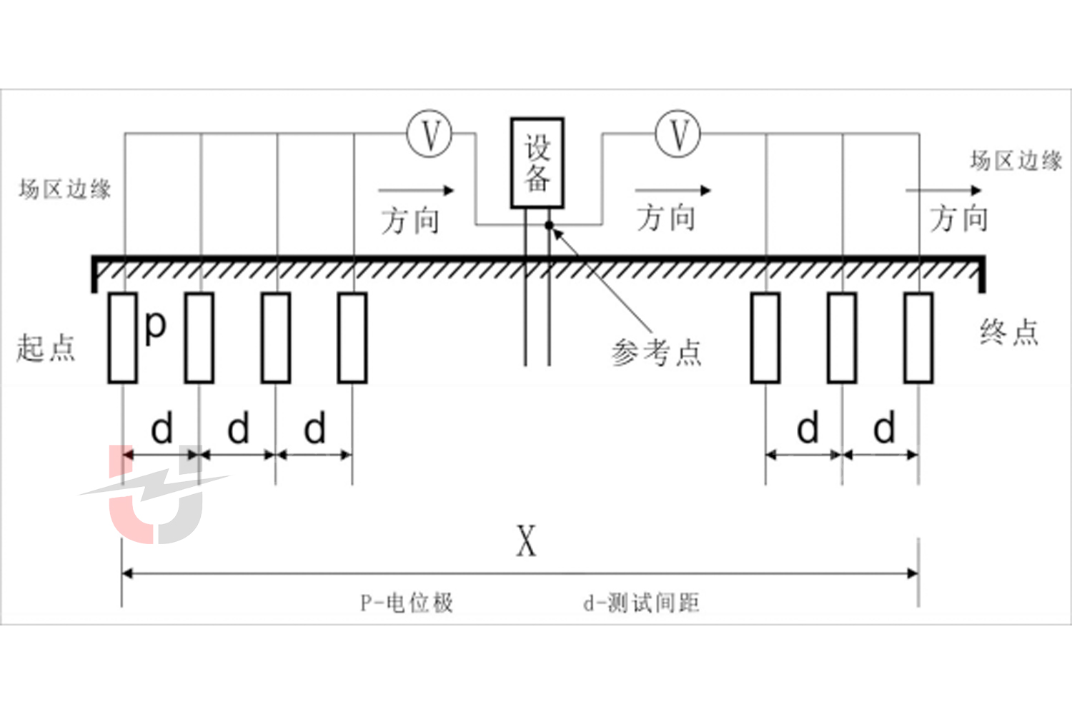 電壓極 P 與接地端的距離(DPE):≈0.618×DCE(基于 “零電位點(diǎn)” 理論,最小化測試誤差),若現(xiàn)場空間受限,可調(diào)整為